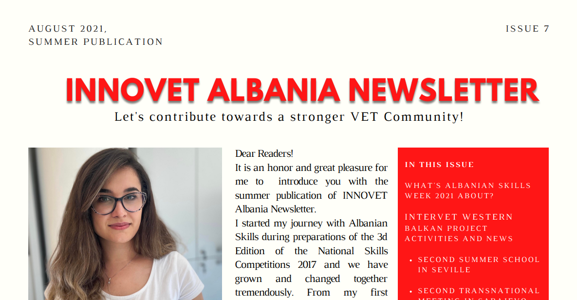 INNOVET Albania Newsletter – Issue 7 – Englishby Endrit Myrtain career academy, career services in municipalities, community, Education, employability, Erasmus, european commission, INNOVET Albania Newsletter, Internationalisation, INTERVET Western Balkans, media, mobility, skills4all, success story, testimonials, VET Community, VET Learners, VET Staffon Posted on 31/08/202113/10/2025 INNOVET-Albania-Newsletter-Summer-Issue-7-English